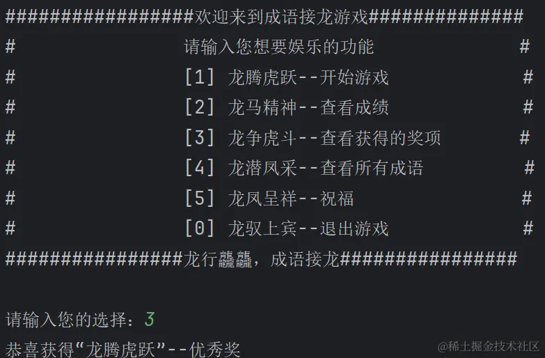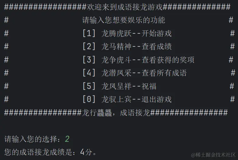 代码初始化了一个score变量用来存储成语接龙的成绩,当查看成绩时,就输出此成绩即可。