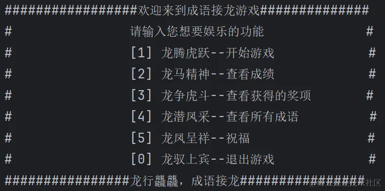 龙飞凤舞的逻辑代码如下:首先保证输入的必须是一个四字成语,且成语存在于我已经在网上下载好的一份成语文件中,如果输入正确,便由计算机开始第一个成语接龙,在guess函数中实现成语接龙的代码。