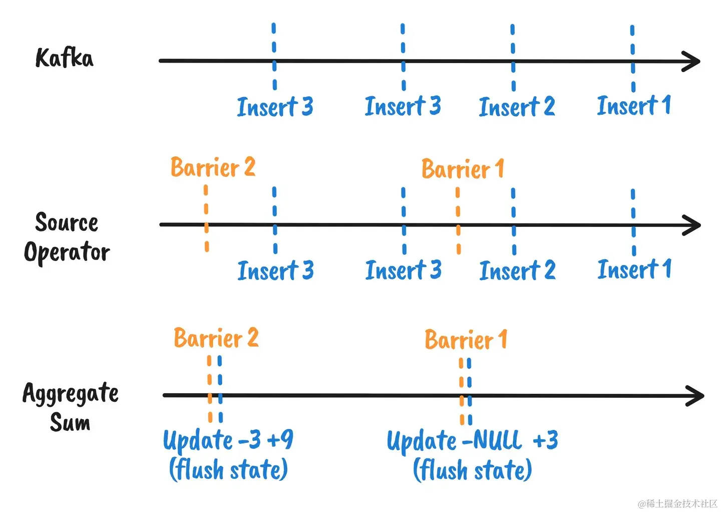 前文中我们提到,算子在收到 barrier 时,会选择 dump 数据到 Hummock,但我们也提到了 barrier 是随着数据流一起流动的,如果每个算子都需要同步地将等待状态被上传到 shared storage(目前是 S3),那么数据处理就会 blocking 一整个上传的 Round trip。如果 DAG 中有 N 个有状态算子的话,那么 barrier 在整个传递过程中就会被 delay N 个 round trip,这对整个系统的处理能力会产生很大的影响。因此,我们将 barrier 的处理流程几乎全异步化了。有状态算子在收到 barrier 后需要做的唯一一件事,就是将当前 epoch 的 local state 同步地 std::mem::take 走,重置为一个空的 state,让算子可以接着处理下一个 epoch 的数据。这也引入了一系列的问题: