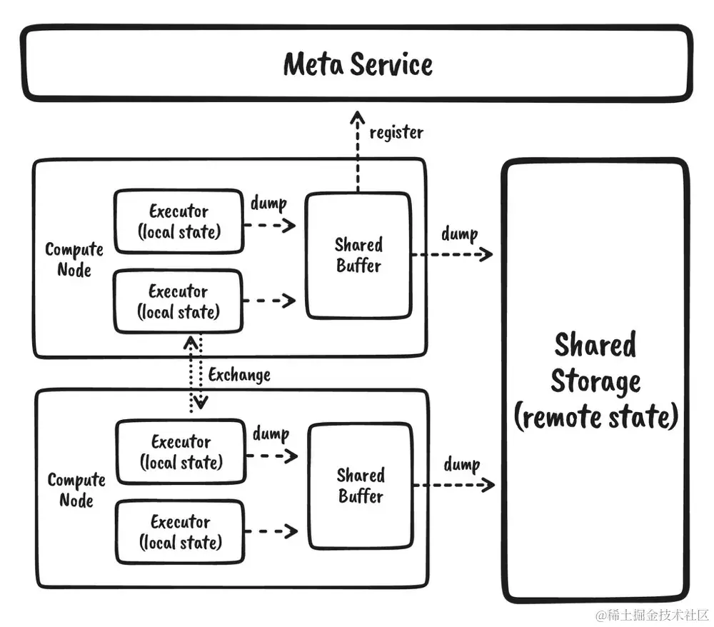 Shared Buffer 是一个 Compute Node 的所有算子共享的一个后台任务,当有状态算子收到 barrier 之后,local state 会被 take 到 Shared Buffer 里。