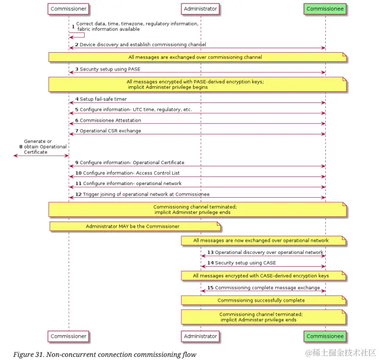 Commissioner使用 CASE 发送 “CommissioningComplete”命令添加到新调试的设备。这是 调试过程的最后一步。自动撤防故障安全定时器。调试成功后,设备将像操作网络上的任何其他节点一样运行。