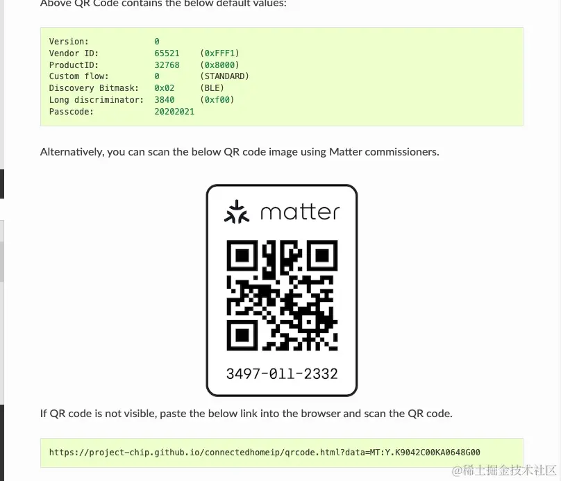 - 手动配对代码,它以数字序列的形式提供入职信息,可供大多数 Matter commissioners使用。