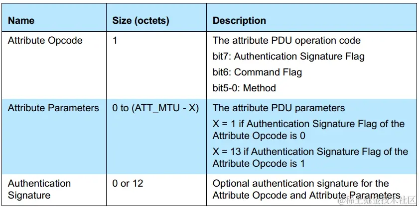 L2CAP协议再上就是我们操作特征值的ATT层,这一层数据长度被 最大传输单元 ATT_MTU限制,ATT_Payload = Attribute OPCode + Attribute Parames + Authentication Signature(可选)组成。排除12字节可选的认证签名,和一个字节属性操作码。