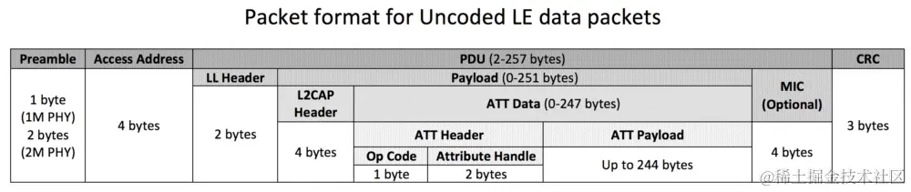 注意: PHY 的数据包最大长度直接由硬件决定,也是限制我们BLE 数据包大小的根本原因。