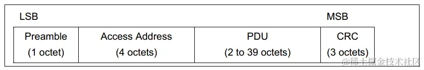 BLE PHY 包格式由以下组成,排除 前导码、访问地址、CRC地址 对于BLE4.0/BLE4.1 上层协议(LL)最大可以包含39字节长度的PDU(协议数据单元)。