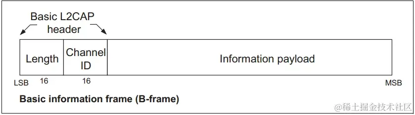 逻辑链路层再往上就是L2CAP——逻辑链路控制适配协议,如下的Basic L2CAP Header+Information Payload组成我们这里的基本帧(B-frame)。