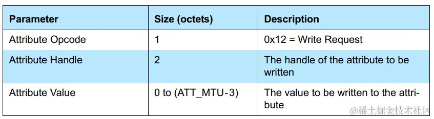 对于我们这里的写属性值,其 Attribute Parameters = 其 Attribute Handle(2) + Attribute Value, Attribute Value 就是我们操作属性的值,其最大长度 = ATT_MTU - Attribute OPCode(1) - Attribute Handle(2) = ATT_MTU - 3。