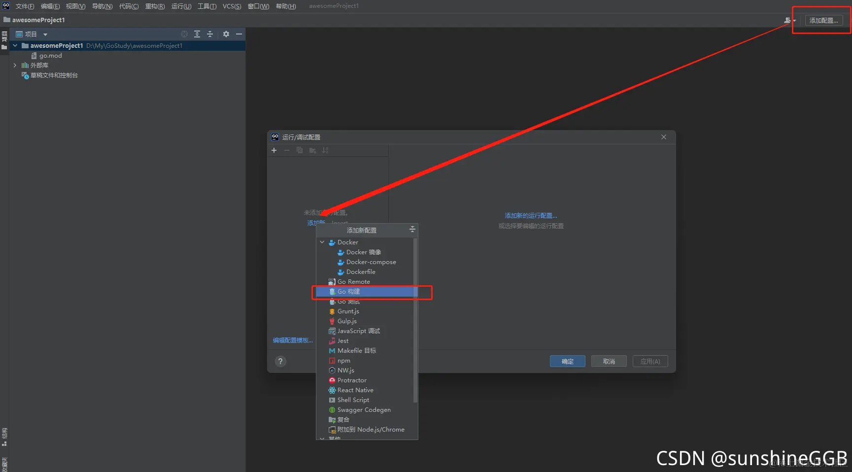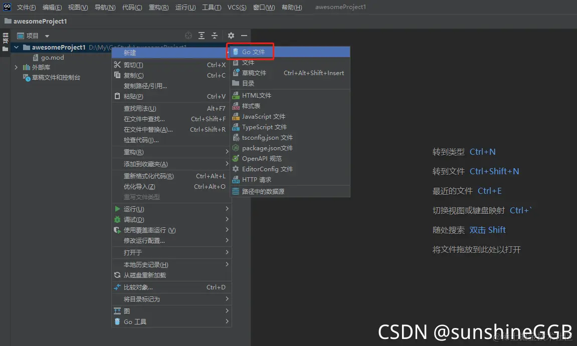 配置完成后,选中项目文件夹,右击新建->Go文件