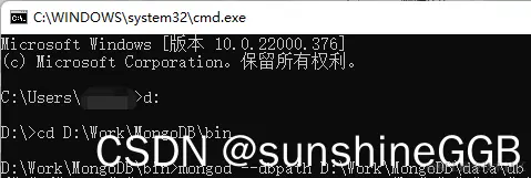 windows+R,输入cmd或者直接搜索打开cmd控制台,输入安装所在盘符的根目录接着就进入安装目录的bin文件夹,接着输入mongod --dbpath D:\Work\MongoDB\data\db指定数据所在目录,具体每步操作指令如下图所示;