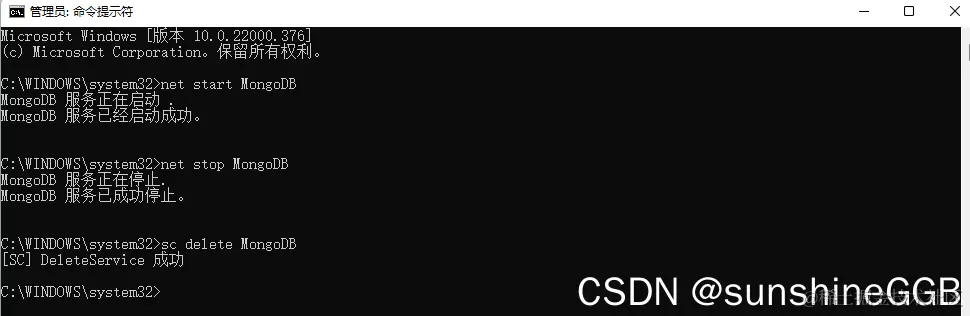 前提是用[cmd管理员]模式运行,下图分别是启动服务、停止服务、删除服务