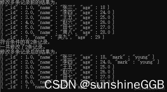 db.students.insertMany([    {"no":1, "stuName":"jack", "age":23, "classNo":1},    {"no":2, "stuName":"tom", "age":20, "classNo":2},    {"no":3, "stuName":"hanmeimei", "age":22, "classNo":1},    {"no":4, "stuName":"lilei", "age":24, "classNo":2}    ])