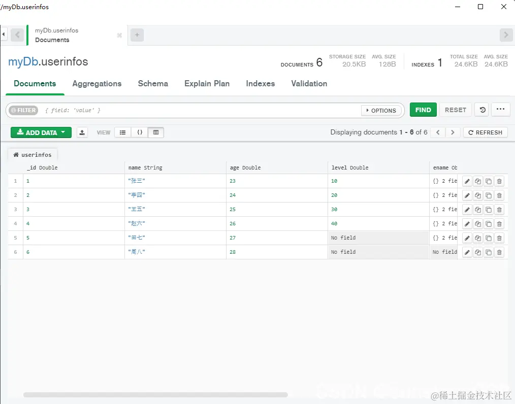 使用之前文章提到的MongoDB Compass用法分别添加数据库[myDb]和集合(表)[userinfos]信息,