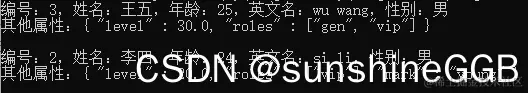 Console.WriteLine($ "编号:{u.userId},姓名:{u.name},年龄:{u.age},英文名:{u.ename?.ming} {u.ename.xing},性别:{u.gender}");