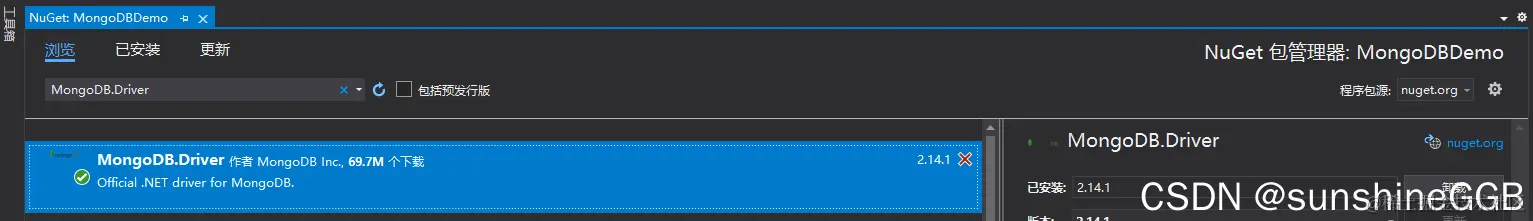 1、使用NuGet包管理器添加MongoDB.Driver