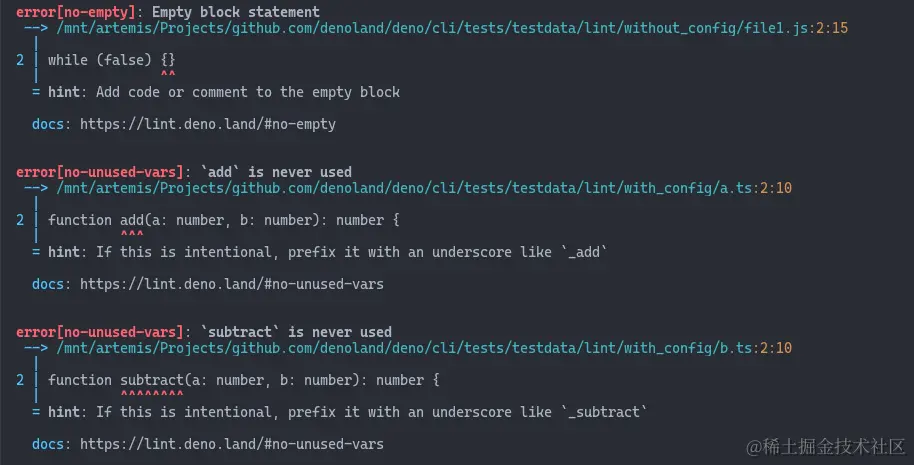 为 deno lint 和 deno doc 引入了新的诊断打印机。我们将在下一个版本中扩展到其他子命令。