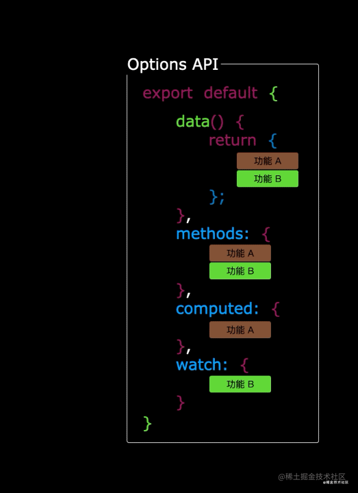 使用传统OptionsAPI中,新增或者修改一个需求,就需要分别在data,methods,computed里修改 。