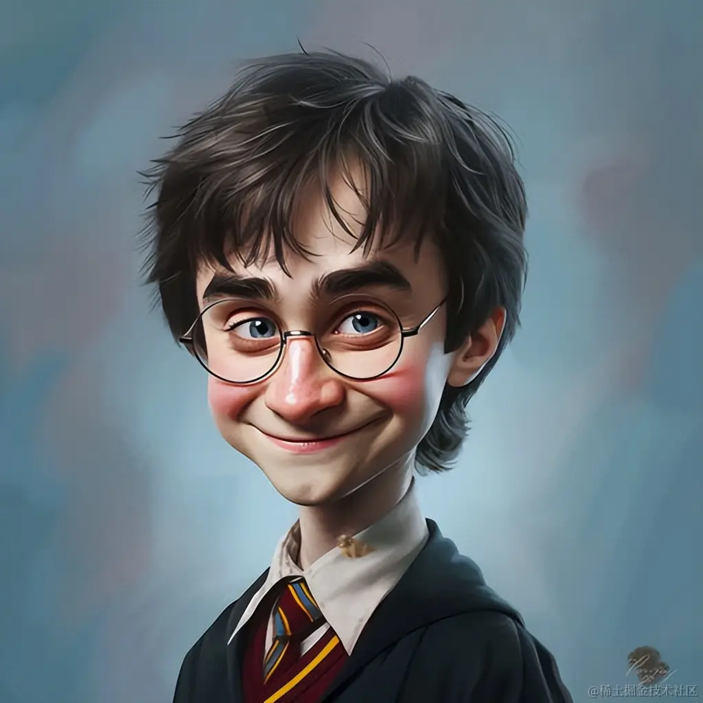 哈利·波特的卡通照片,采用Goosepunk的风格,精心设计,光滑闪亮,微笑核心,创意共用归因,深白和浅天蓝,怪诞卡通。