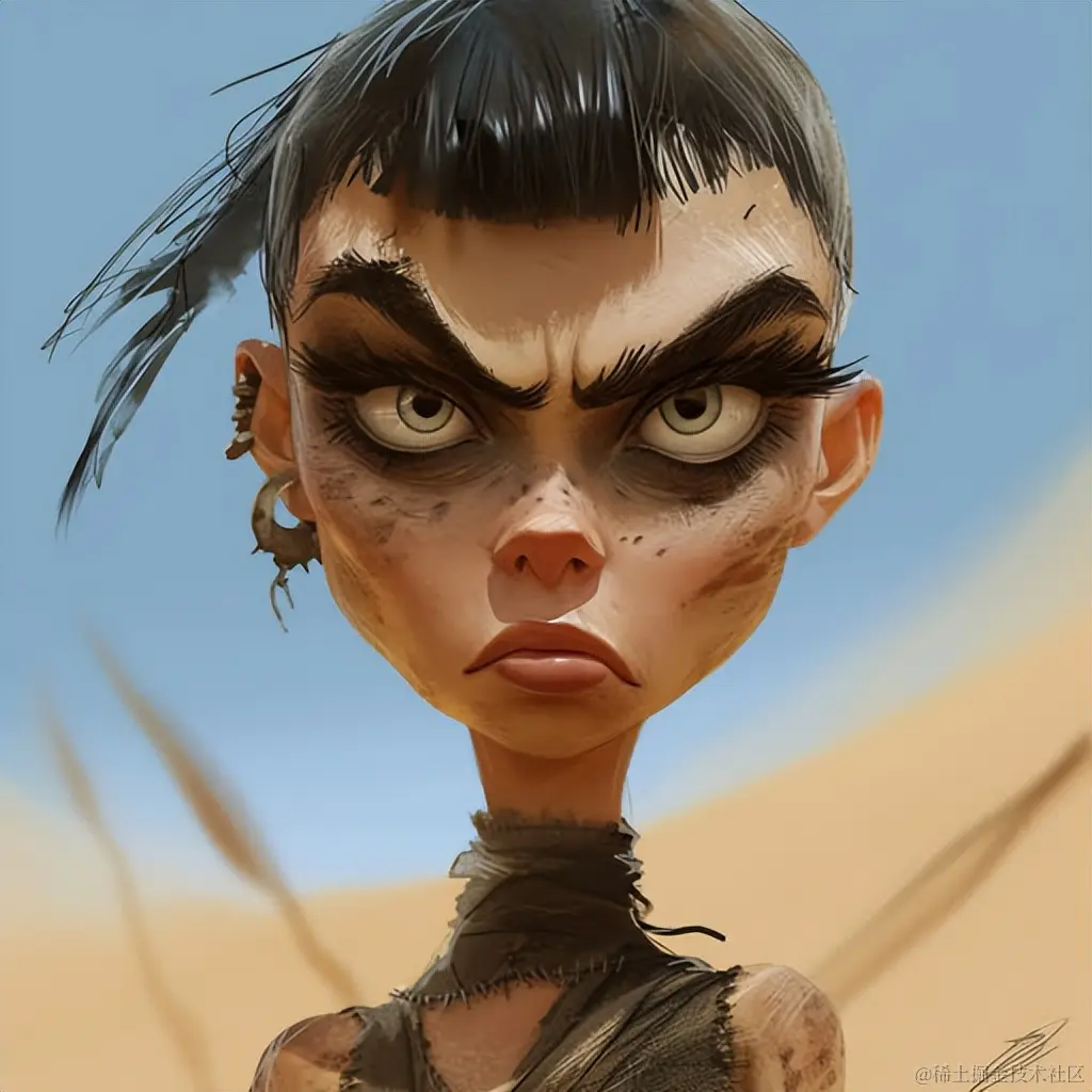 caricature of Mad Max character Furiosa, in the style of aggressive digital illustration, disney animation, gothic references, loose paint application, whiplash curves, spiky mounds, elegant, emotive faces