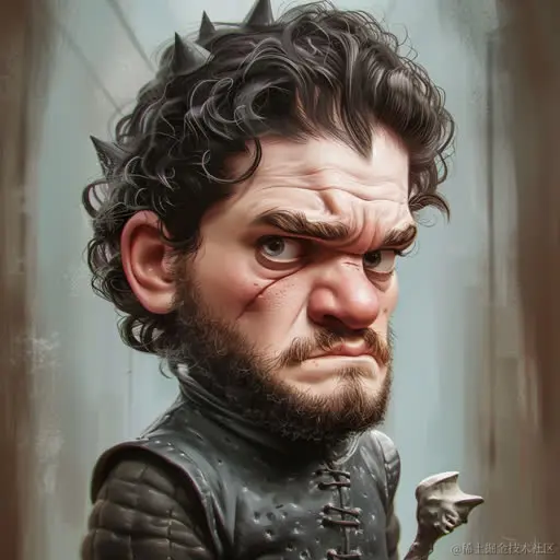《权力的游戏》雪诺卡通的漫画,以写实肖像画家Aykut Aydogdu的风格,强烈的面部表情,写实肖像,哥特核心,尖锐的山丘,卡通写实。