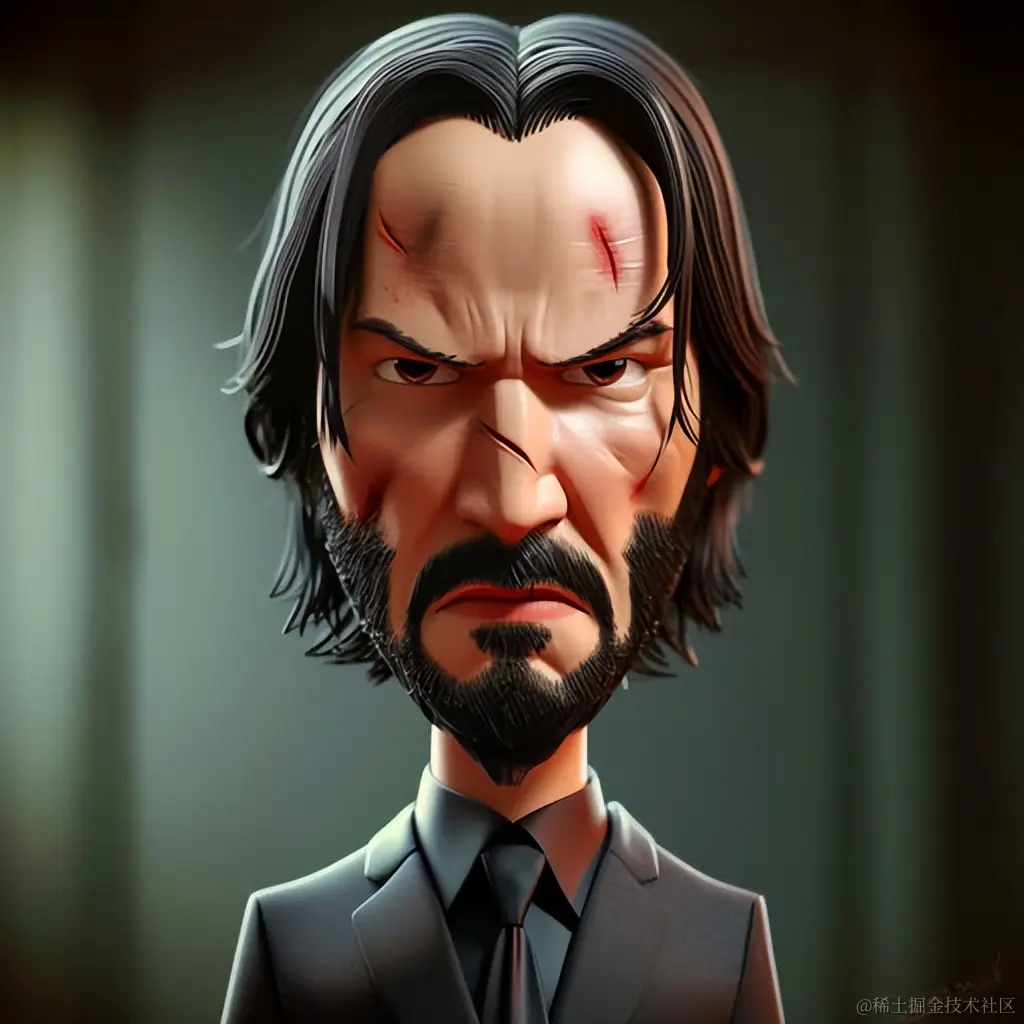 愤怒的约翰·威克看着摄像头,采用数码气刷风格,卡通面孔。