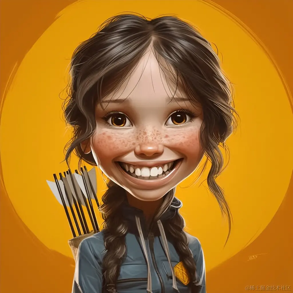 带牙齿的Katniss Everdeen的卡通画,采用标志性的流行文化卡通风格,深黄,天使核心,哈苏H6D-400C,数码气刷,迪士尼动画,名人的真实镜头。