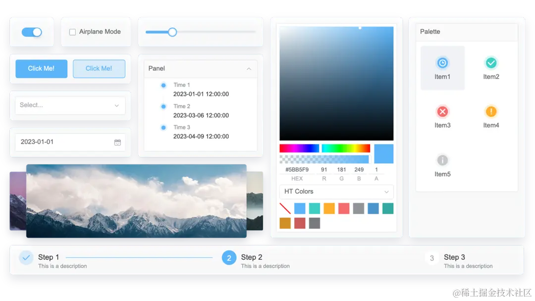为了适应移动设备的特殊性,HT UI 5.0 在组件设计上考虑了移动端的屏幕大小、交互方式和操作习惯。组件库中提供了专门为移动端设备设计的日期选择、滑块等组件,以确保在移动设备上的用户体验更为方便、流畅。