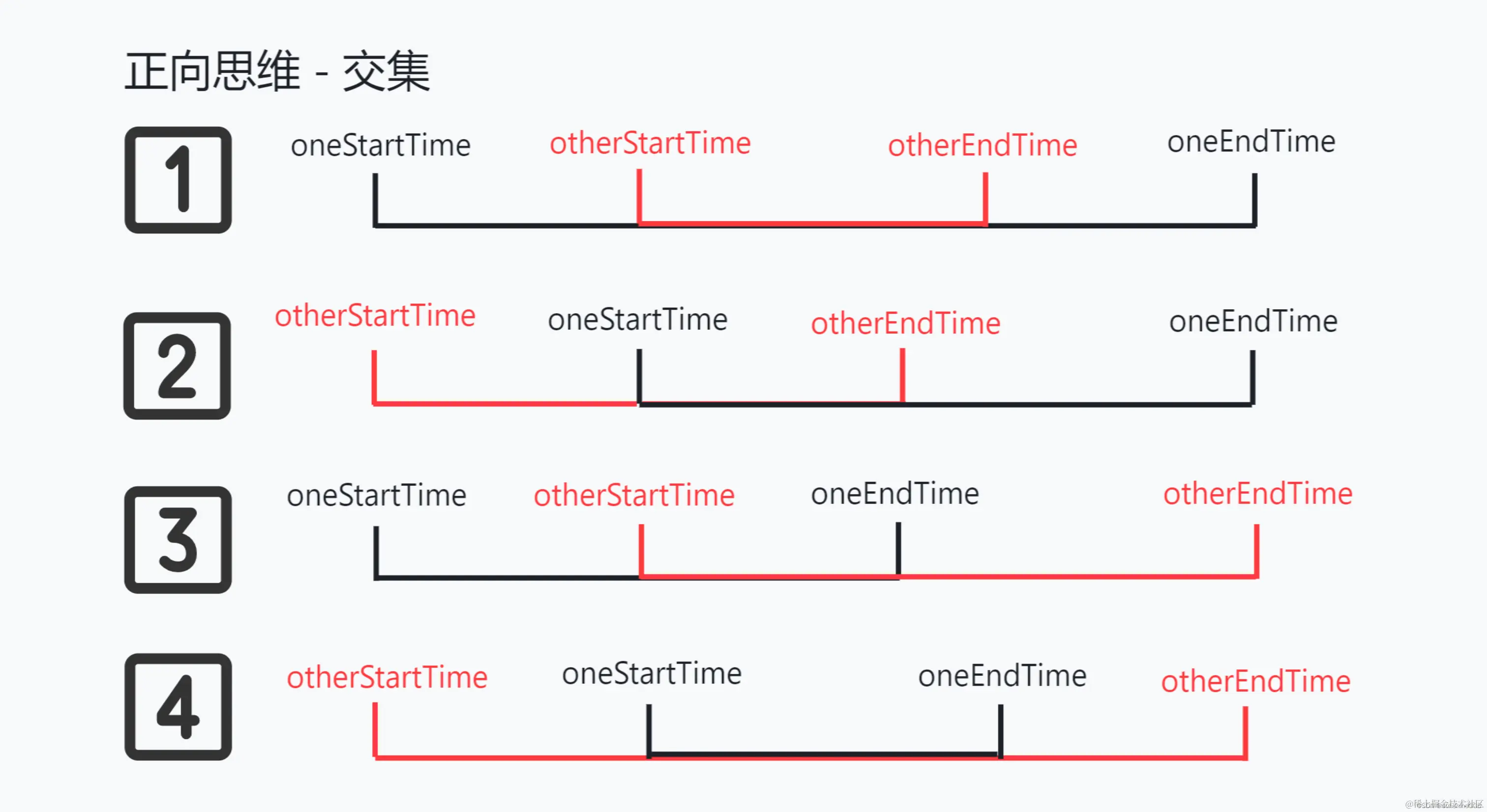 oneStartTime <= otherEndTime && oneEndTime >= otherStartTime