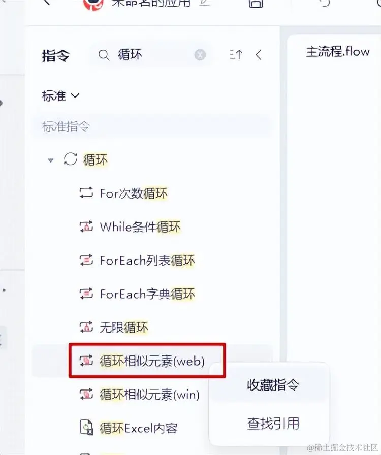 这里使用循环相似元素(web)指令,像这种常用的指令我们可以右键收藏起来,这样下次用就方便一些: