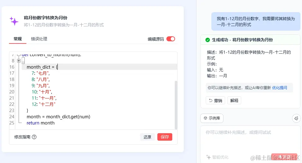 很简单的Python代码,估计是chatgpt写的。总的来说还是很方便的,接上文我们需要根据数字的月份得到中文的月份,这里还可以再次使用魔法指令: