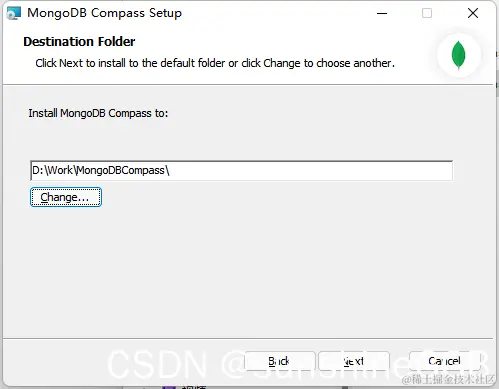 2)选择安装路径,建议是选择别的盘符,选择钱最好先创建好安装MongoDB Compass的文件夹或者在安装路径地址框直接输入如D:\Work\MongoDBCompass\自动创建,接着点击Next按钮进入下一步;
