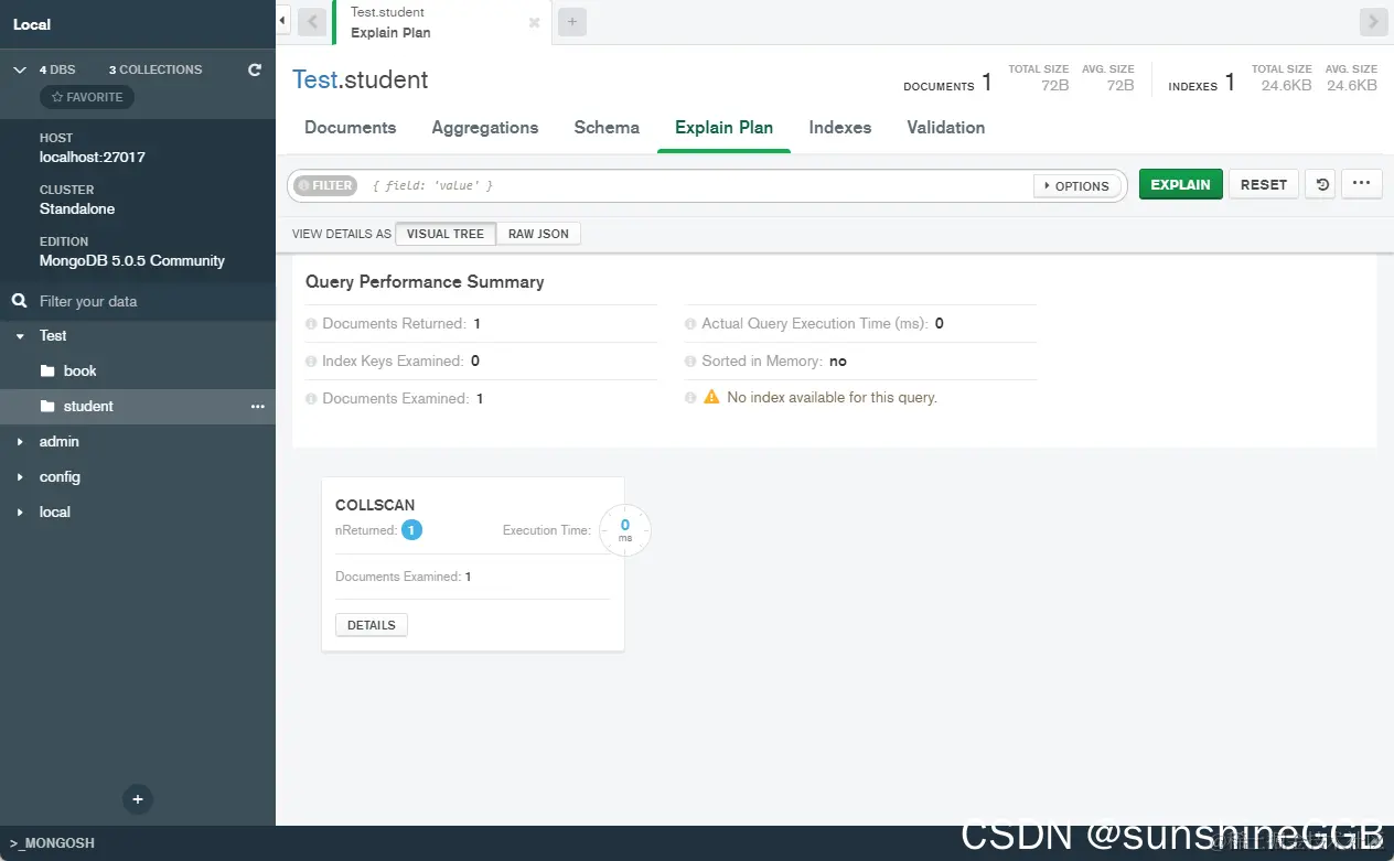 如下图所示,点击[Schema]选项卡即是模式信息区,点击分析按钮可以看到当前集合(表)的执行信息,如表数据导入时间,表的具体字段、长度等信息;
