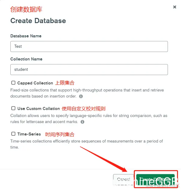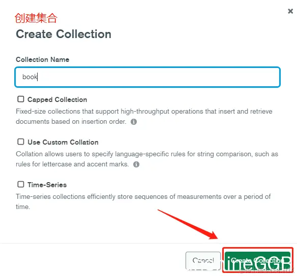 如下图所示,填入集合(表)名称,下面是哪个选项和创建库的选择一样不做具体说明(见上图),点击[Create Collection]创建集合(表);