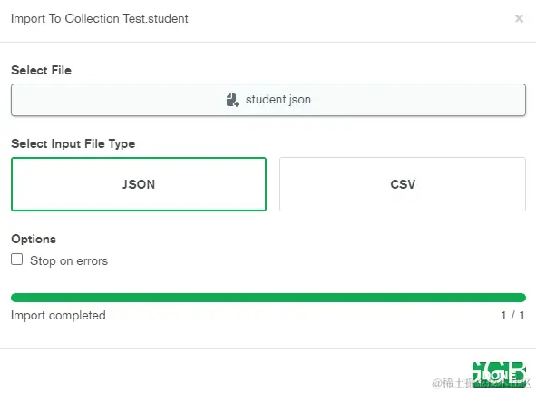 点击[Document]选项卡下的[ADD DATA]按钮导入集合(表)数据 ,导入文件格式可选JSON格式或CSV表格格式,文件里的内容格式必须符合导入文件格式的规范,即标准的JSON或CSN格式,点击[DONE]按钮导入,会提示导入成功或导入异常信息,导入成功后如上图所示;