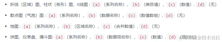 formatter: '{b0}: {c0}<br />{b1}: {c1}', // 提示框浮层内容格式器,支持字符串模板和回调函数两种形式,模板变量有 {a}, {b},{c},{d},{e},分别表示系列名,数据名,数据值等,具体见下图