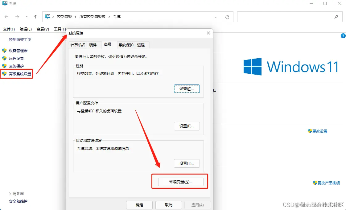 1)右击我的电脑-->属性,进入系统属性界面,点击如下图所示位置的[高级系统设置],在弹窗的[系统属性]的[高级]选项卡右下角点击[环境变量]按钮;