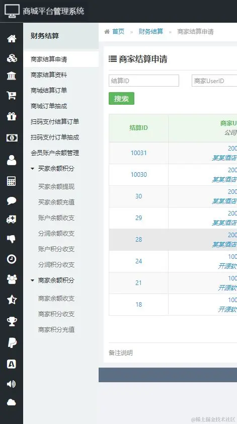 2)商家结算,对账,清分: 对商家在平台产生的销售,进行对账,结算,清分。结算清分中,对商家抽成,分润进行结算分析统计,并生成详细的结算清单。结算系统提供结算金额划转到商家账号自动入口。
