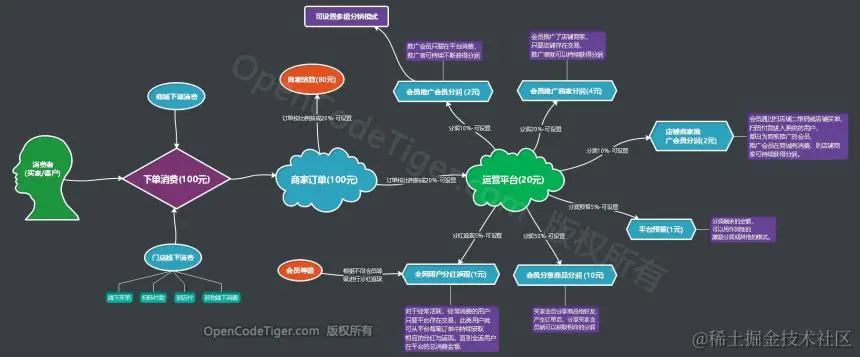 1)抽成系统:平台可以对不同商家产生的订单自由设置抽成比例,抽成金额用于后续的各种分润模式。