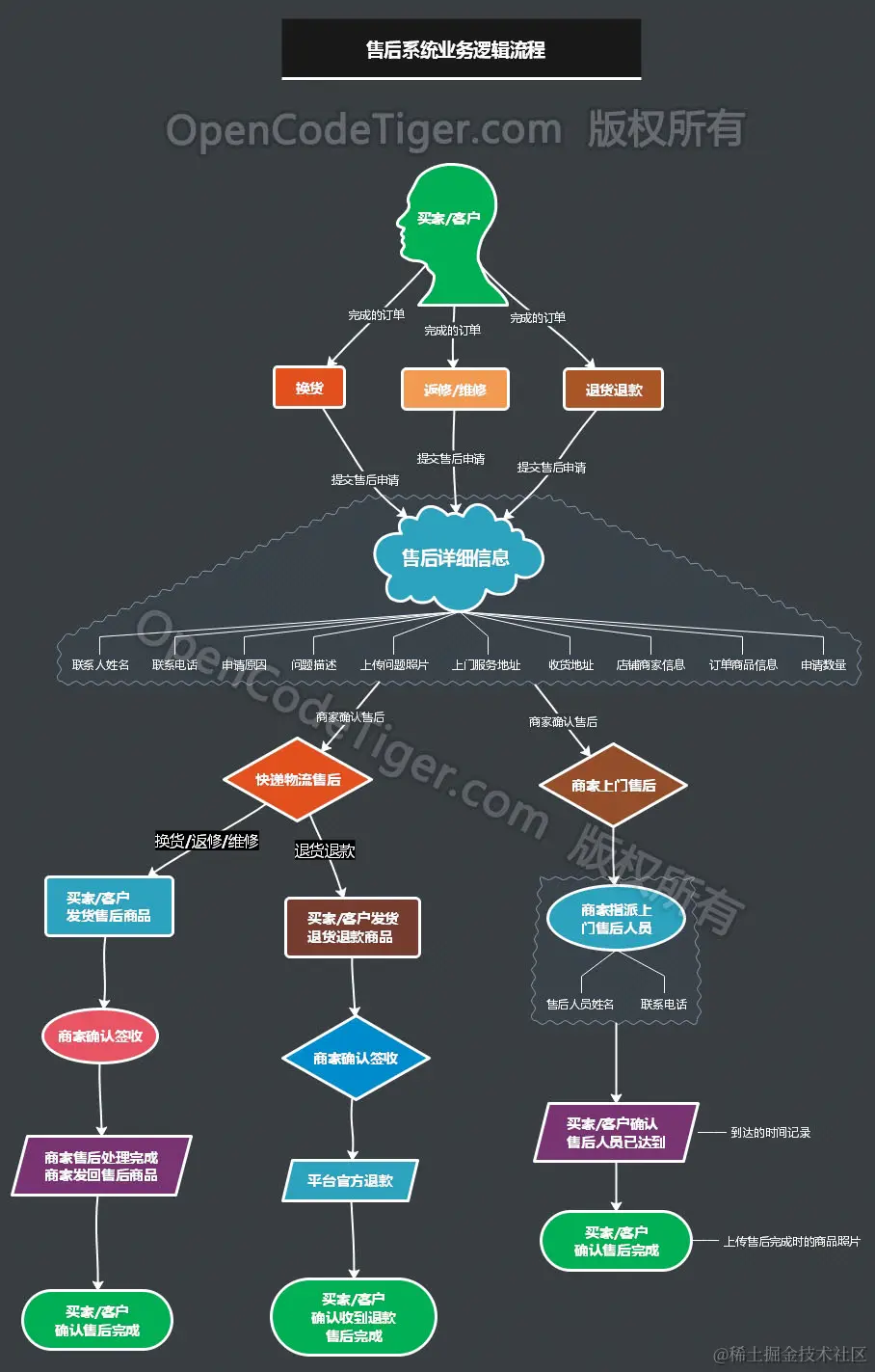 2)商家可以选择售后方式:物流快递售后 或 上门售后两种,售后流程与逻辑请查看导图。