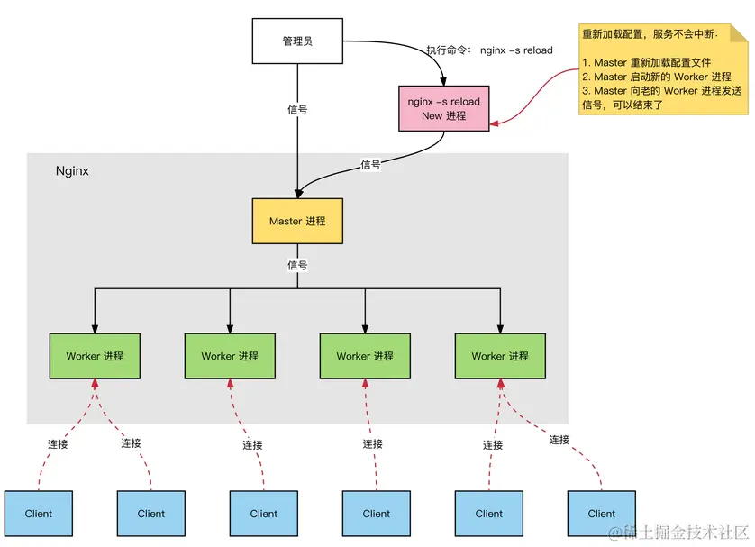 - 监控:监控 worker 进程的运行状态,worker 进程异常终止后,自动重启 worker 进程