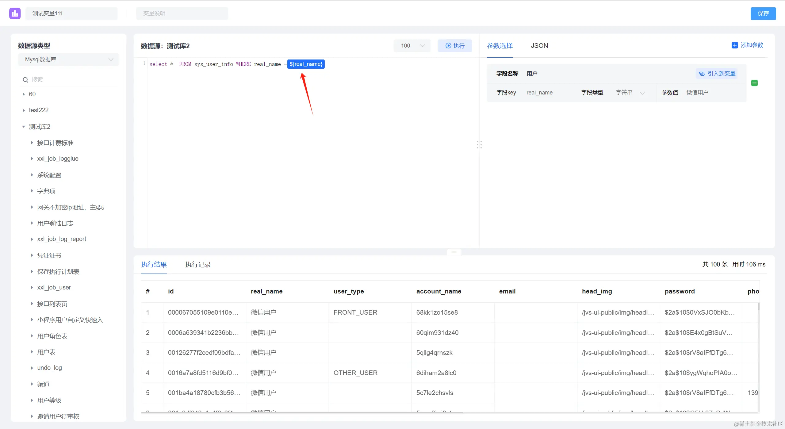 在SQL变量使用的过程中,往往存在需要通过业务端传入的参数去过滤查询的数据,那么就需要通过参数的方式进行SQL脚本的编写,如下图所示: