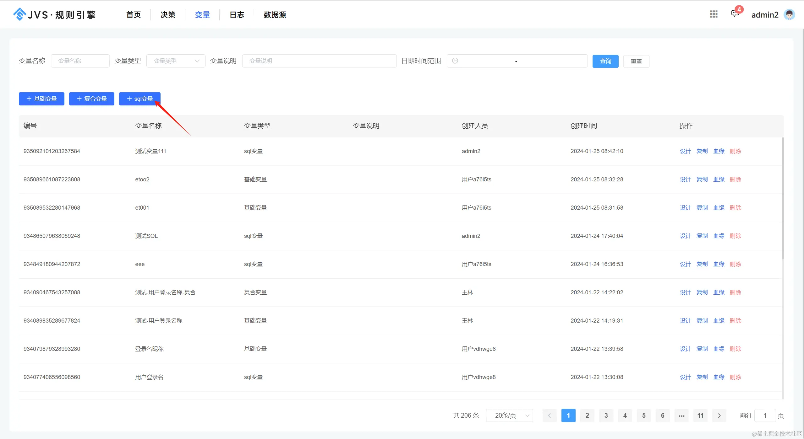 注意,SQL变量加工和算子编排加工的方式不同,SQL变量加工依赖于对应数据源的服务器的性能,在使用前,需要确认下数据库是否有可用的多余的性能满足新增SQL执行的性能消耗(避免影响原有系统的性能)。