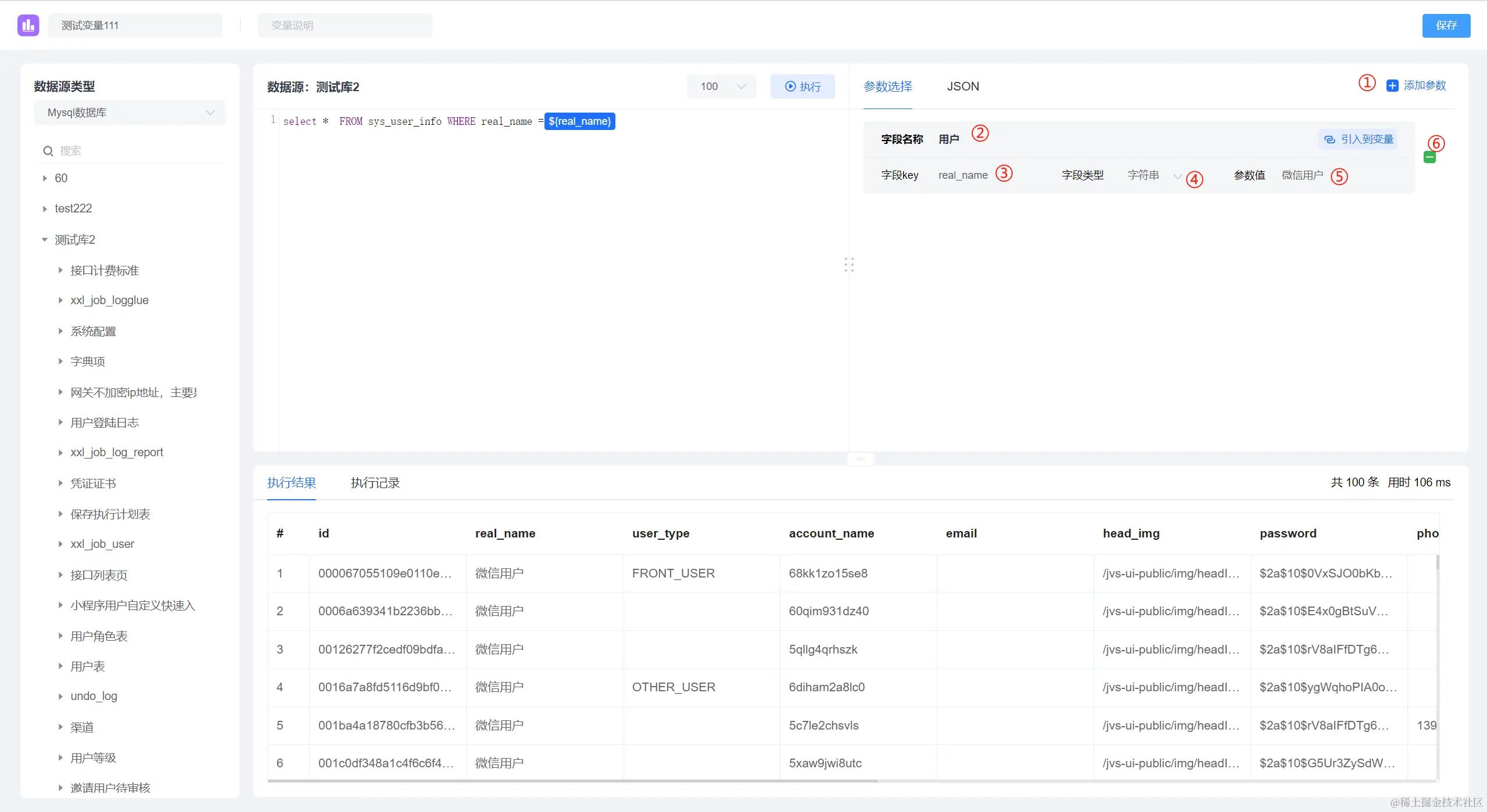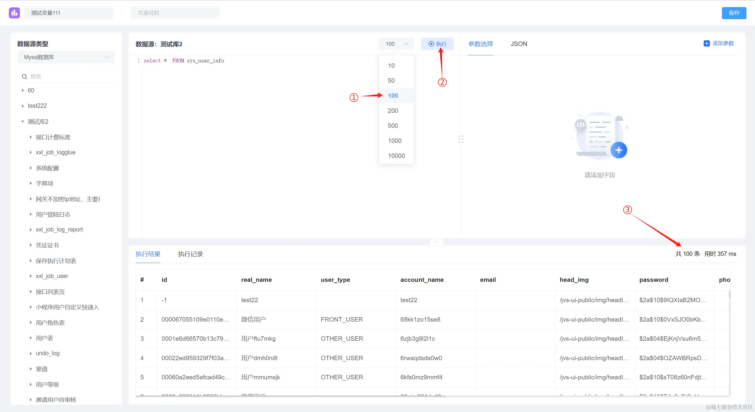 ①:数据源选择,点击下拉框,展示系统支持的多个数据源(数据库)