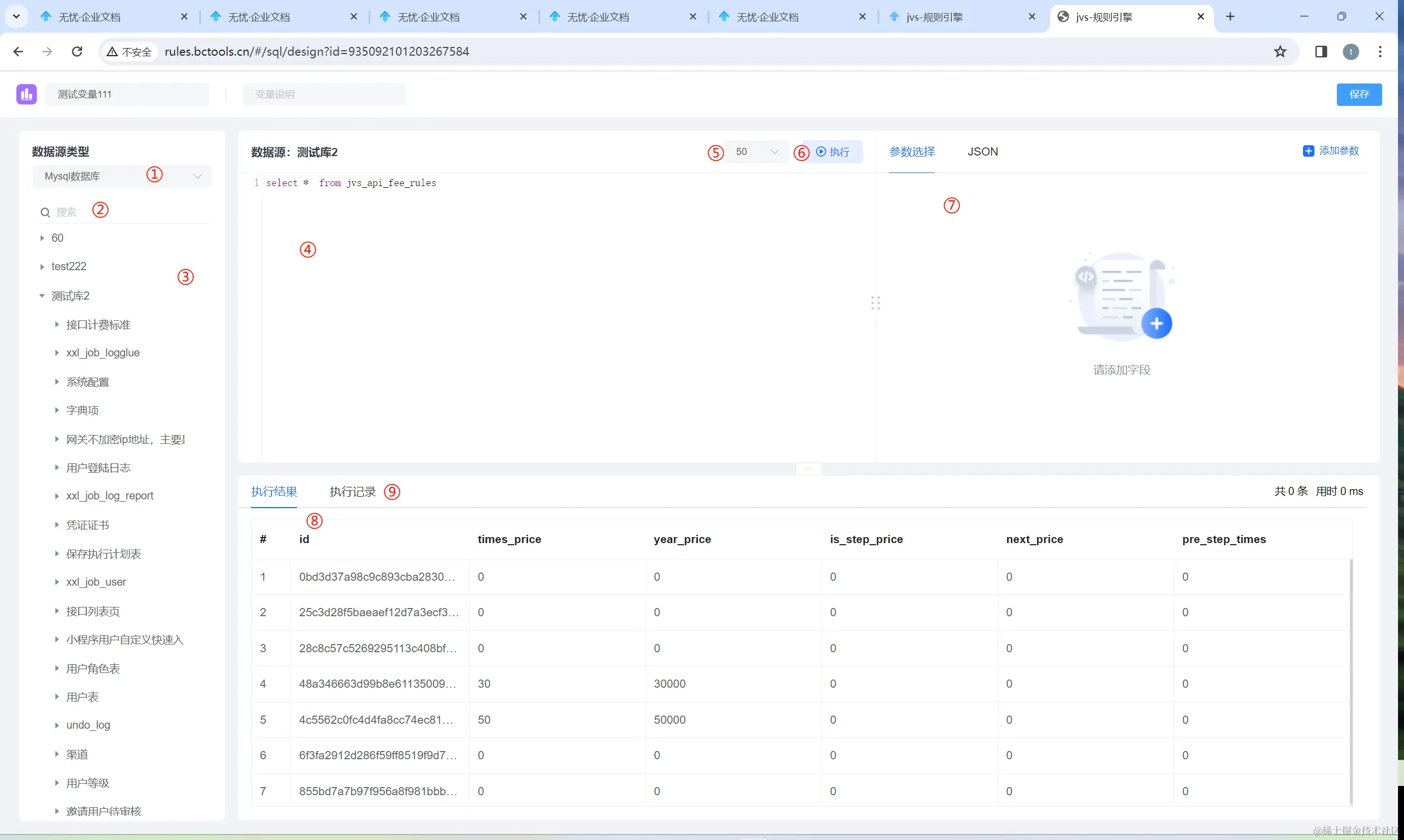 ⑦:参数设置窗,可以设置需要查询传递进入SQL脚本中的参数