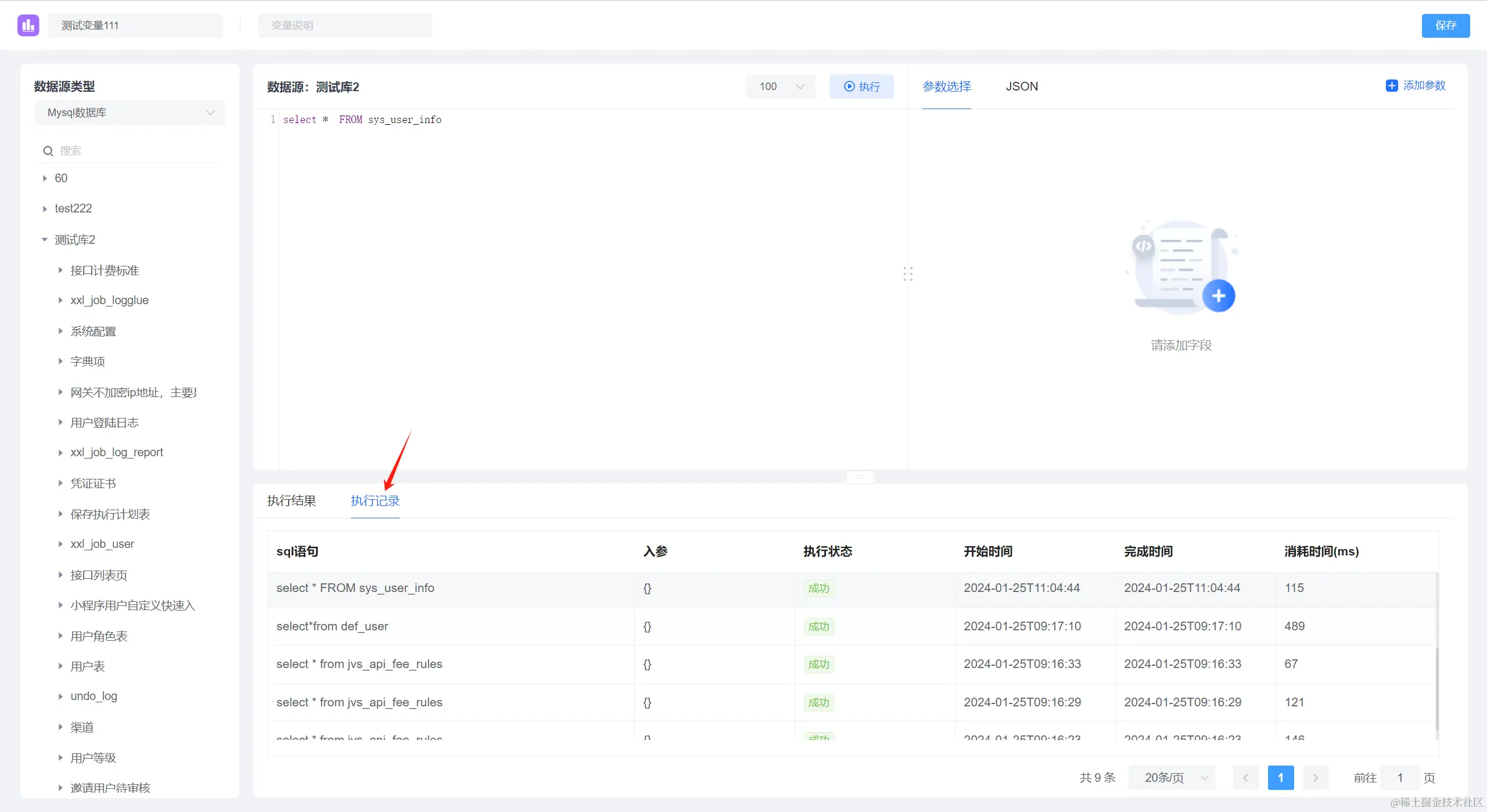 系统提供了sql脚本执行历史记录的展示,包括执行语句,执行状态,输入参数,起止时间等