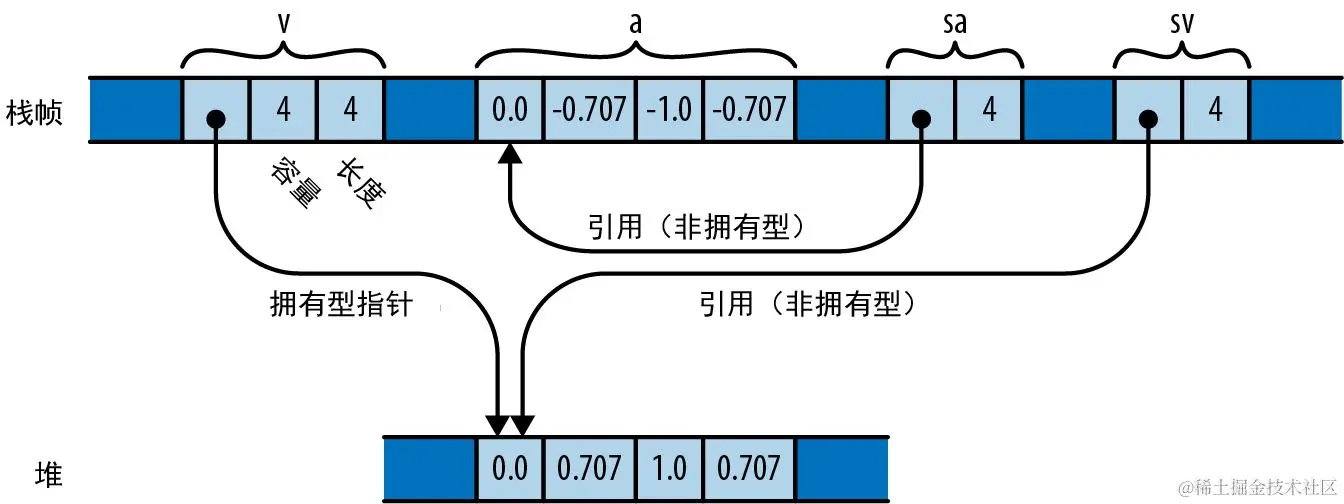 在最后两行中,Rust 自动把 &Vec<f64> 的引用和 &[f64; 4] 的引用转换成了直接指向数据的切片引用。