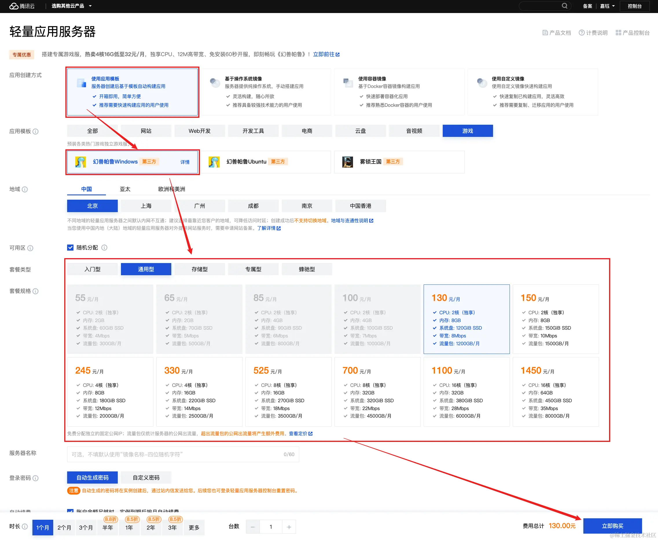 1、通过游戏服务器专属优惠页或腾讯云轻量应用服务器Lighthouse购买页,选择“幻兽帕鲁Windows”,并点击立即购买。