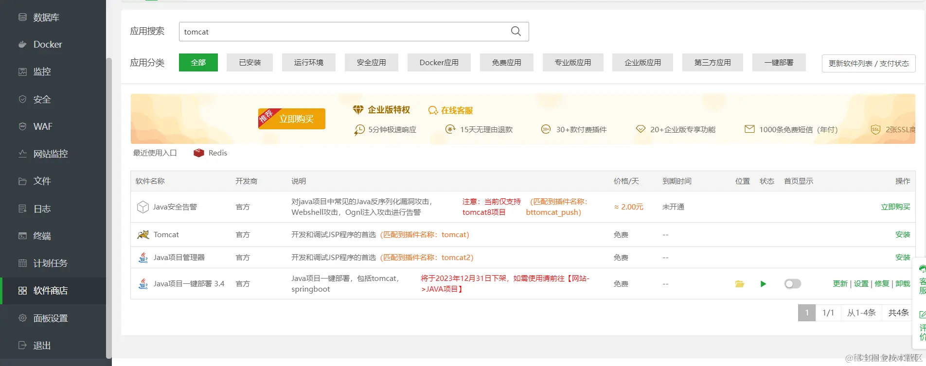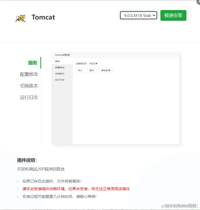 进入软件商店搜索tomcat,版本选择9.x,直接极速安装。