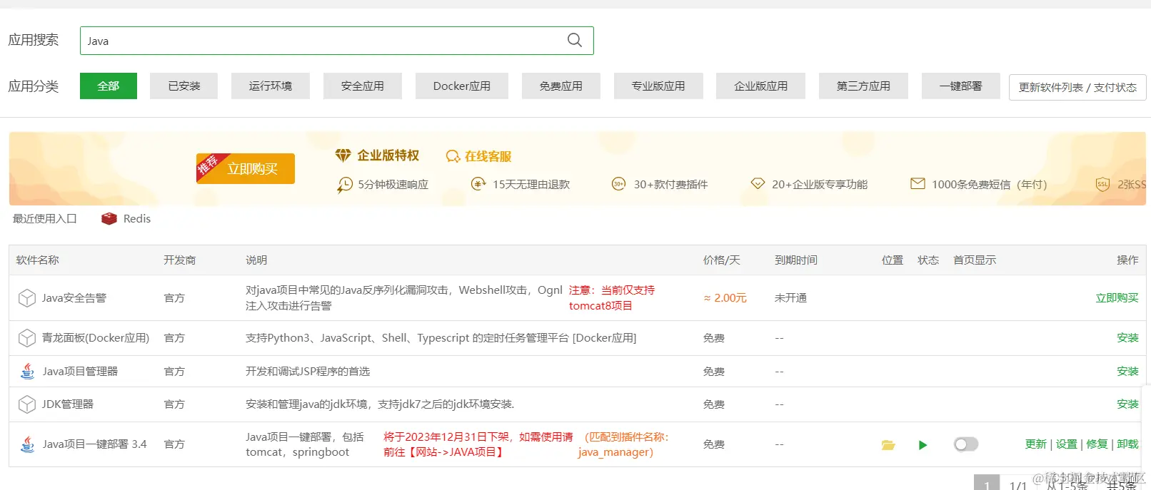 在软件商店里面搜索并安装Java项目一键部署