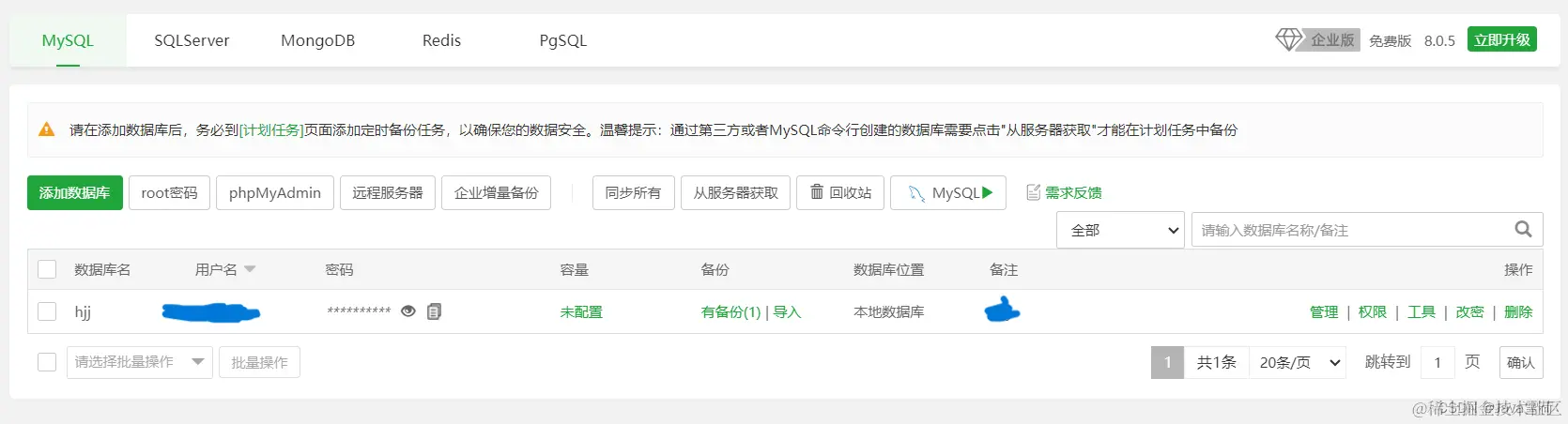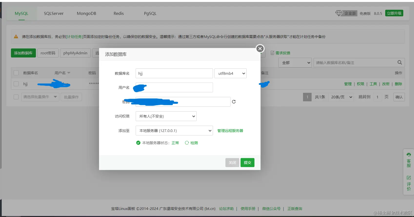 安装完成后,点击侧边栏中的数据库,再点击添加数据库。选一个数据库名字要和yml文件中连接MySQL数据库的库名一致,用户名和密码也对应yml中的MySQL用户名和密码。访问权限,暂时选择所有人,方便后续使用navicat或者IDEA往线上数据库添加数据,当然后续可以在设置中修改。
