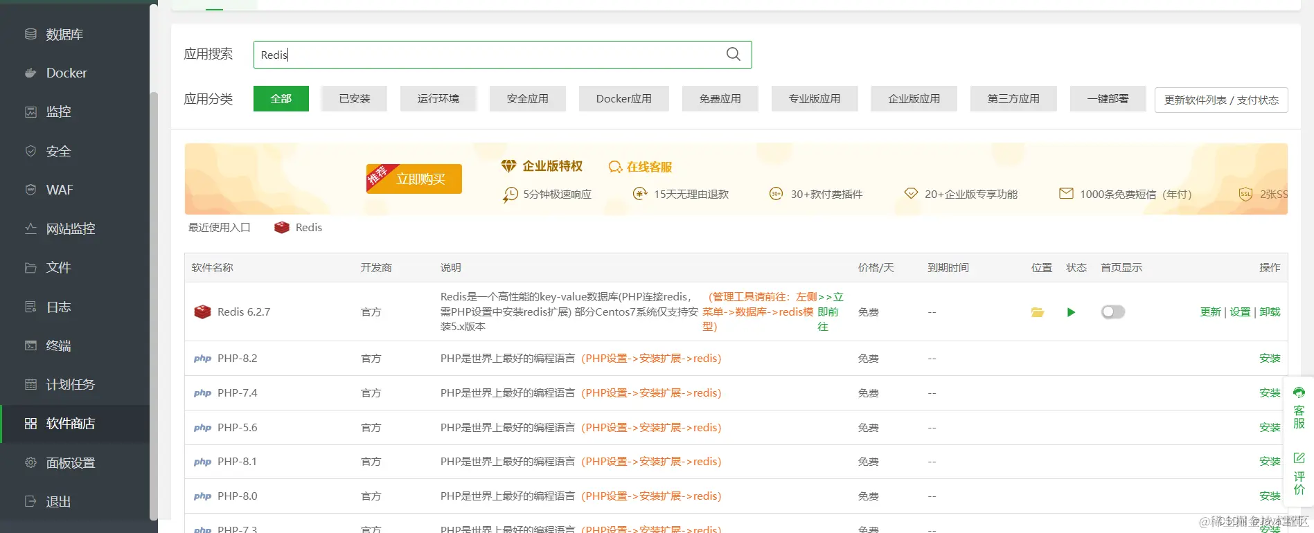 安装Redis也是一样,在软件商店里面搜索,点击安装。我安装的是6.x版本,因为我自己电脑安装的是5.x版本,安装过高害怕有问题。